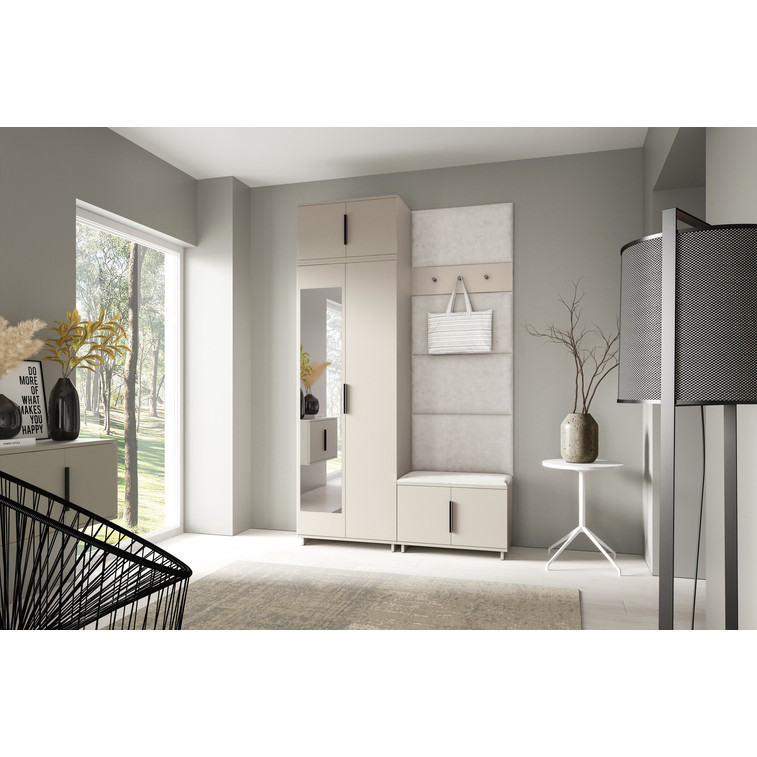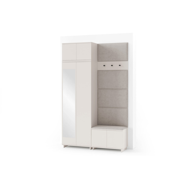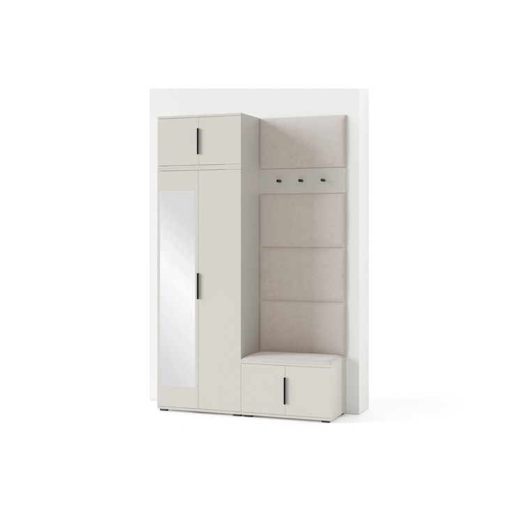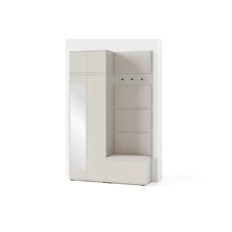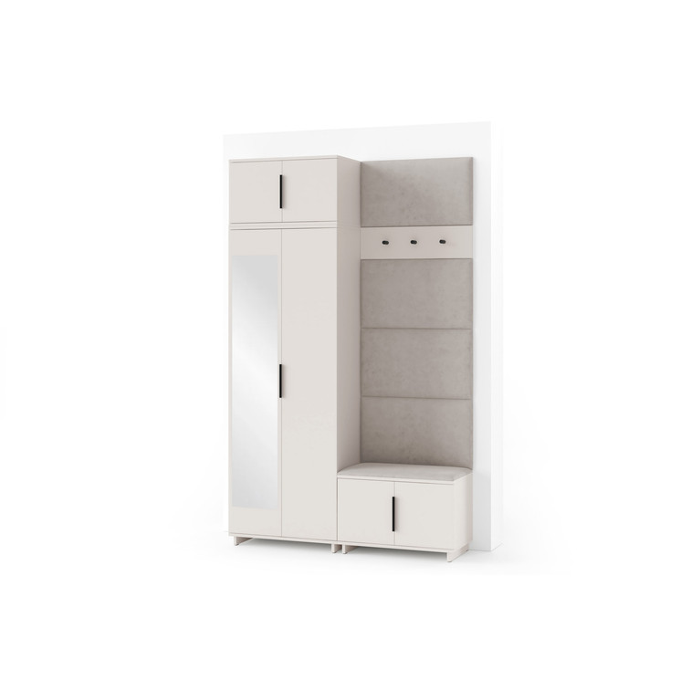 Je to praktický prvok do vstupných priestorov vášho domu. Predsieňová stena obsahuje čalúnené panely, ktoré sa montujú priamo na stenu za pomoci lepidla. Poťah panelov je tkanina Trinity. Predsieňová stena sa skladá z niekoľkých častí. Táto sada obsahuje: 1x šatníkovú skriňu, 1x nadstavba, 1x botník, vešiak, 5 panelov.
