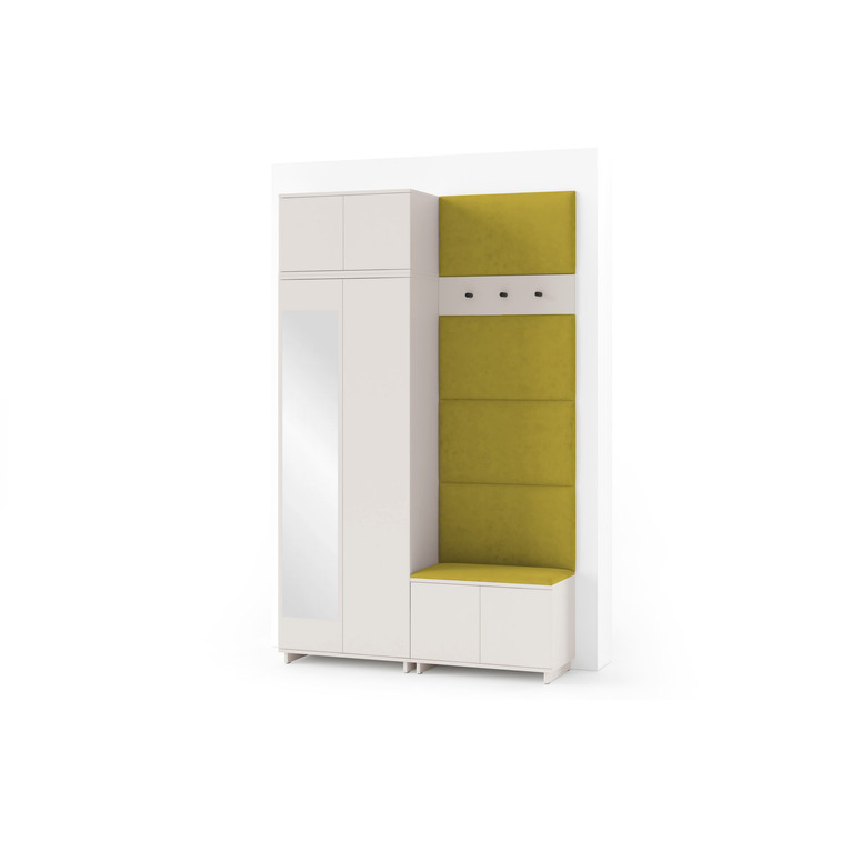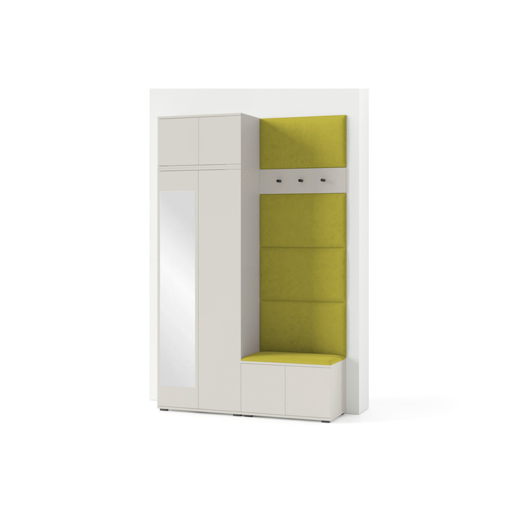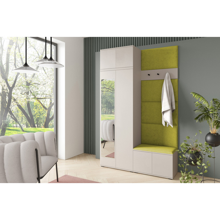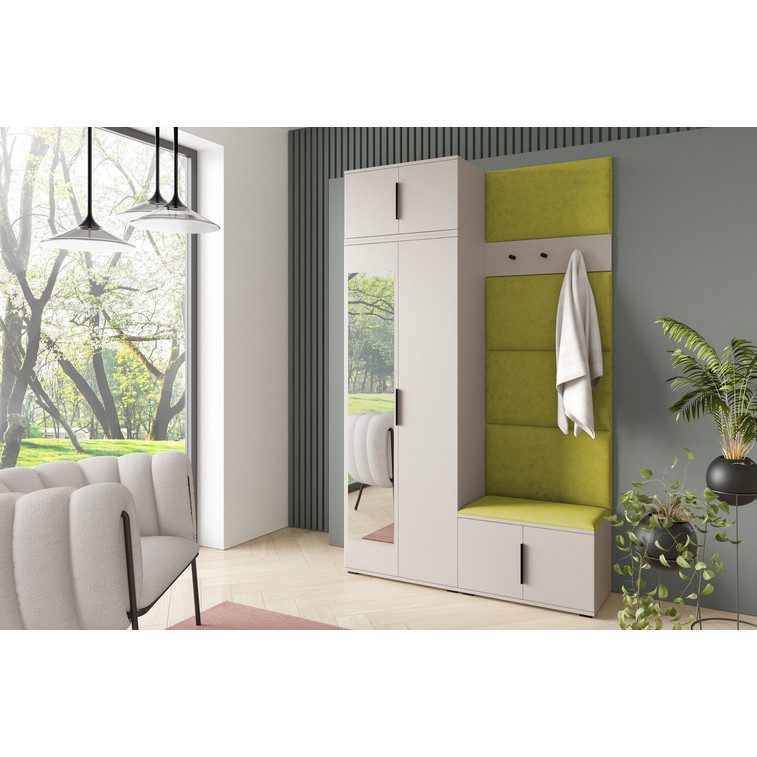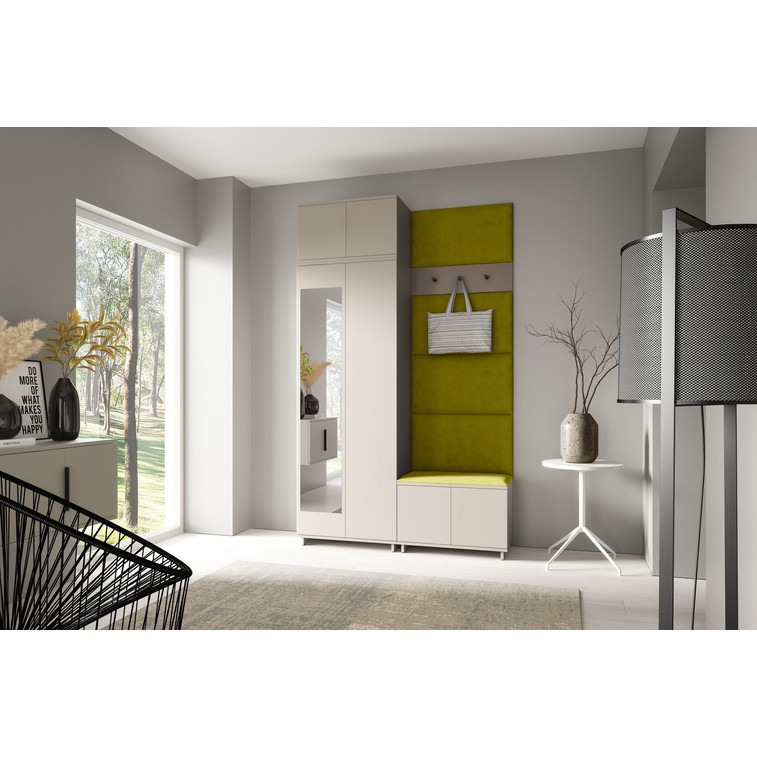 Je to praktický prvok do vstupných priestorov vášho domu. Predsieňová stena obsahuje čalúnené panely, ktoré sa montujú priamo na stenu za pomoci lepidla. Poťah panelov je tkanina Trinity. Predsieňová stena sa skladá z niekoľkých častí. Táto sada obsahuje: 1x šatníkovú skriňu, 1x nadstavba, 1x botník, vešiak, 5 panelov.