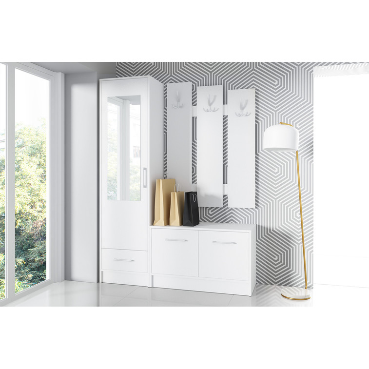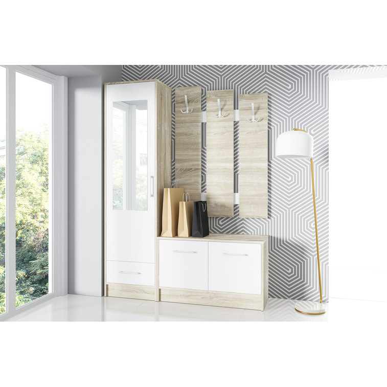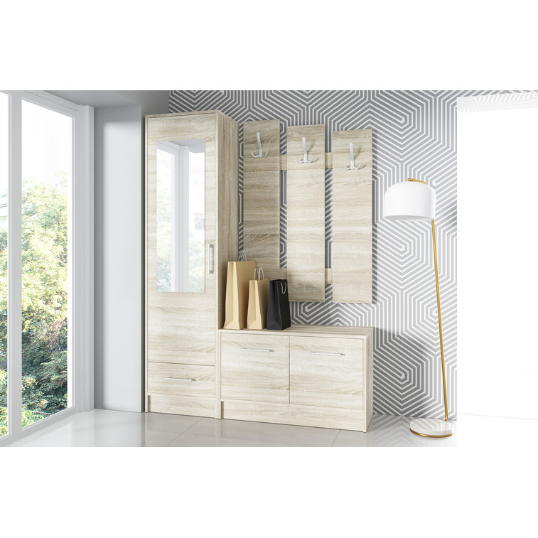 Predsieňová stena Maxi je vyrobená z kvalitného lamina v dekore dreva, nohy a úchytky sú vyrobené z plastu v striebornej farbe.