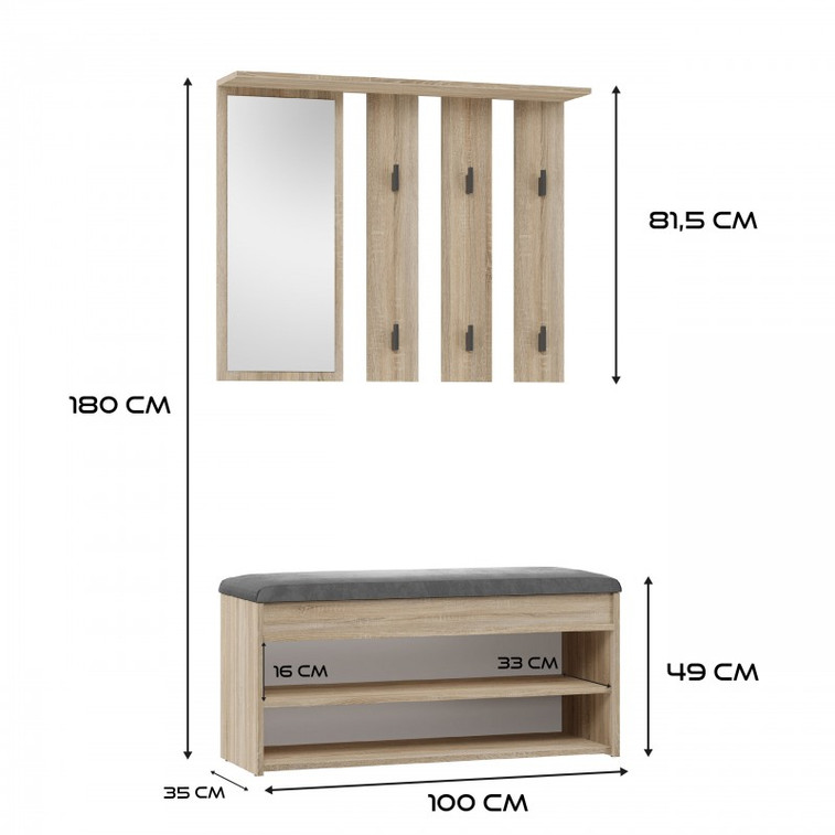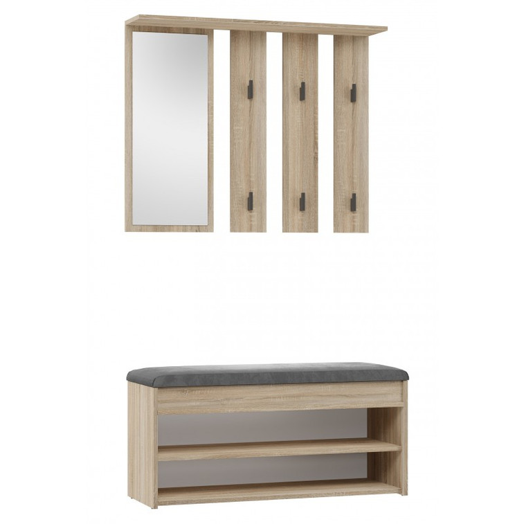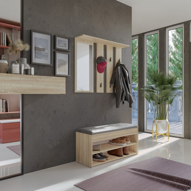 Predsieňová stena PARMA 2P je moderný a praktický prvok do vstupných priestorov vášho domu. Skladá sa z niekoľkých častí. Táto predsieňová stena ponúka dostatok úložného priestoru pre vaše veci. Vďaka svojmu nadčasovému vzhľadu, premení podobu každej predsiene. Botník so sedákom je uspôsobený pre šesť, až osem párov topánok. Vždy záleží na veľkosti obuvi.