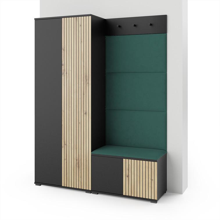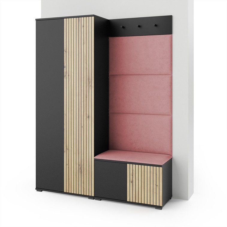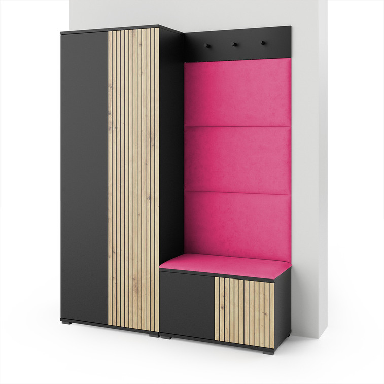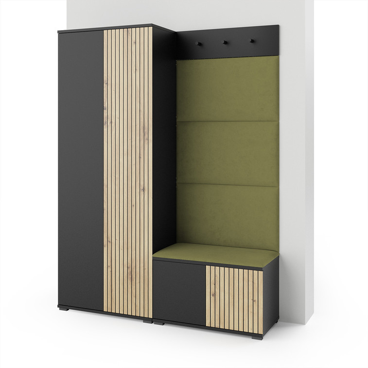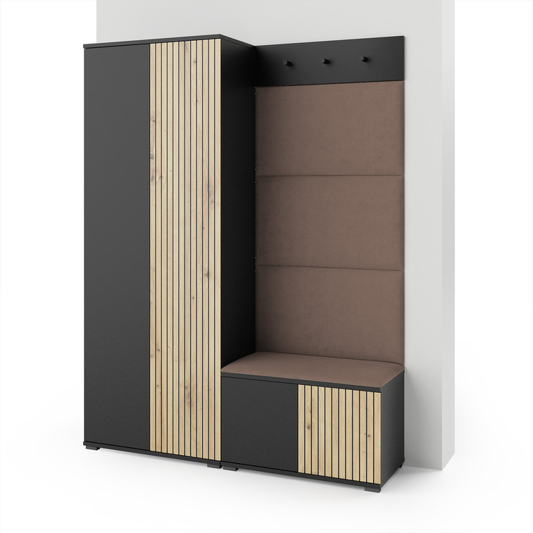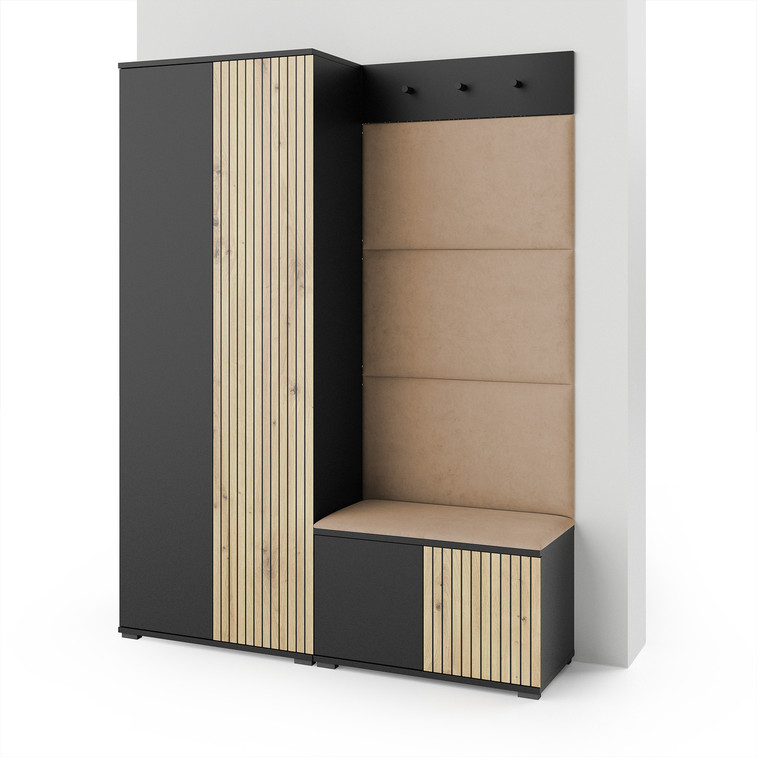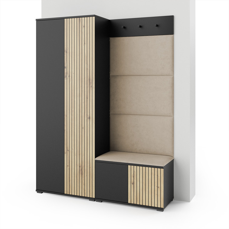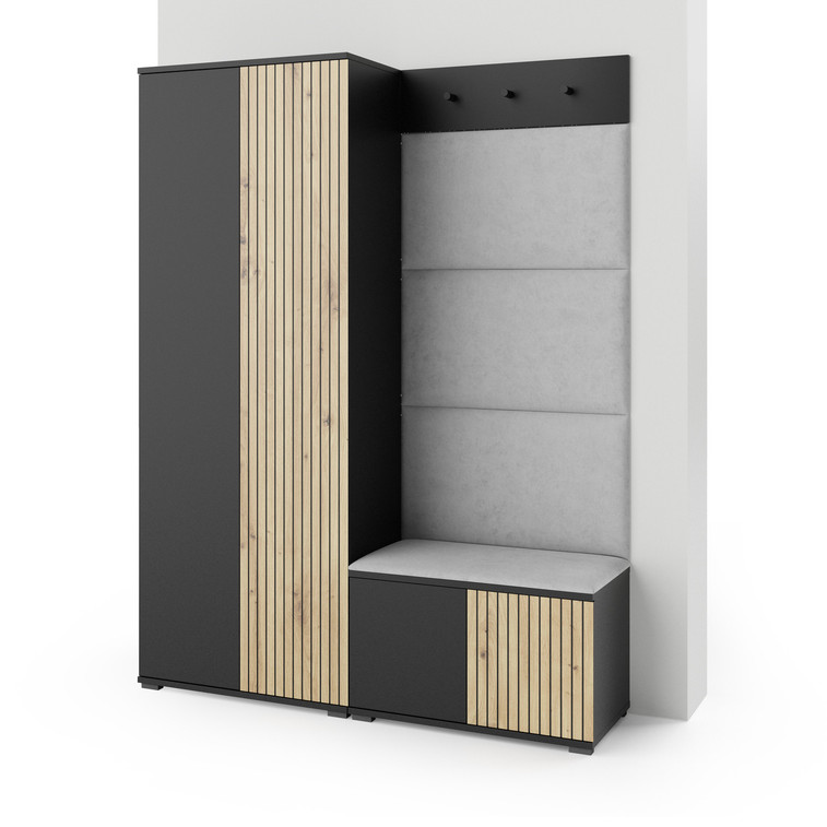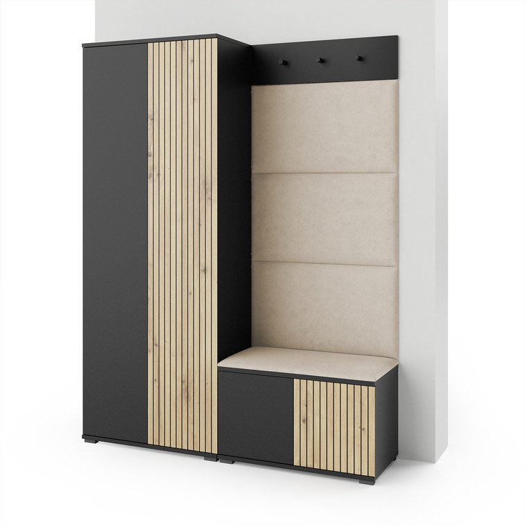 Moderná predsieňová stena je praktický prvok do vstupných priestorov vášho domu. Predsieňová stena obsahuje čalúnené panely, ktoré sa montujú priamo na stenu za pomoci lepidla. Poťah panelov je tkanina Trinity. Bezúchytkové čelá dvierok zaisťujú pohodlné používanie - systém TIP-ON otvára sa jemným zatlačením na čelo dvierok.