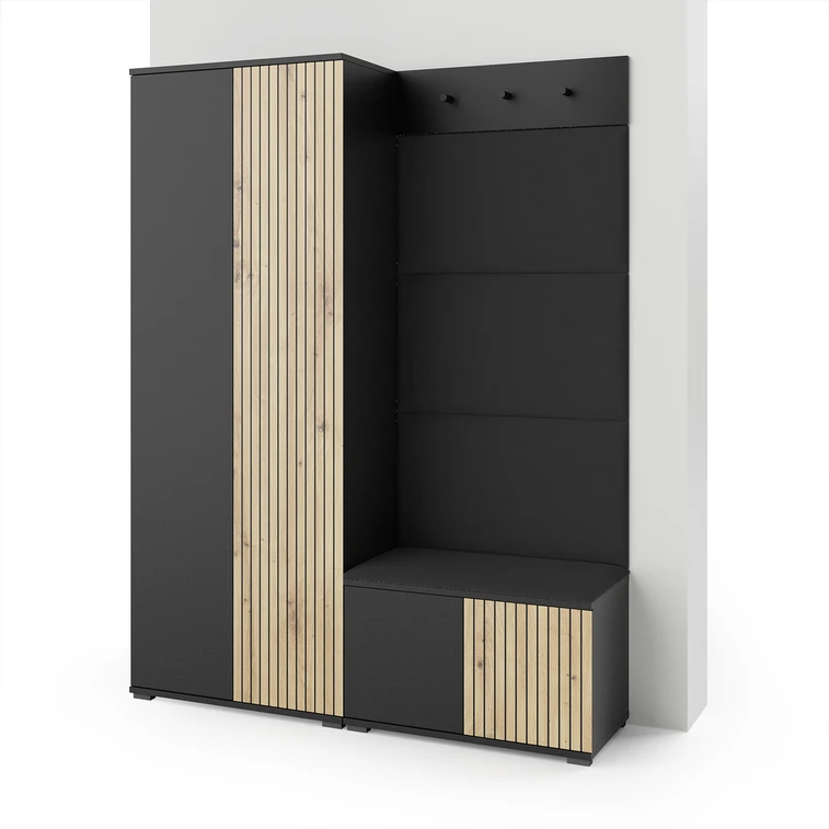 Moderná predsieňová stena je praktický prvok do vstupných priestorov vášho domu. Predsieňová stena obsahuje čalúnené panely, ktoré sa montujú priamo na stenu za pomoci lepidla. Poťah panelov je tkanina Trinity. Bezúchytkové čelá dvierok zaisťujú pohodlné používanie - systém TIP-ON otvára sa jemným zatlačením na čelo dvierok.