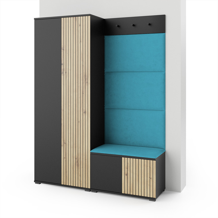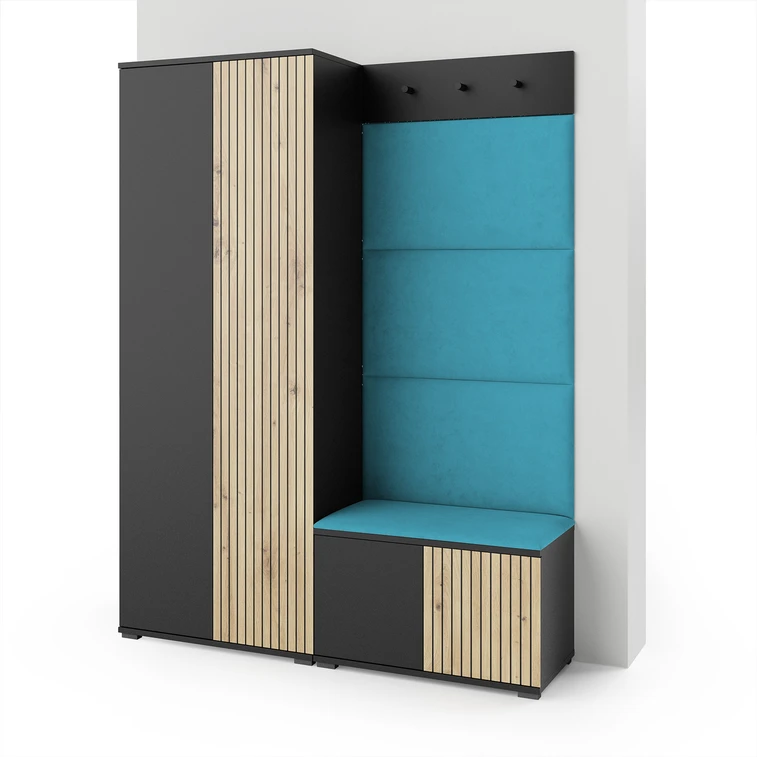 Moderná predsieňová stena je praktický prvok do vstupných priestorov vášho domu. Predsieňová stena obsahuje čalúnené panely, ktoré sa montujú priamo na stenu za pomoci lepidla. Poťah panelov je tkanina Trinity. Bezúchytkové čelá dvierok zaisťujú pohodlné používanie - systém TIP-ON otvára sa jemným zatlačením na čelo dvierok.