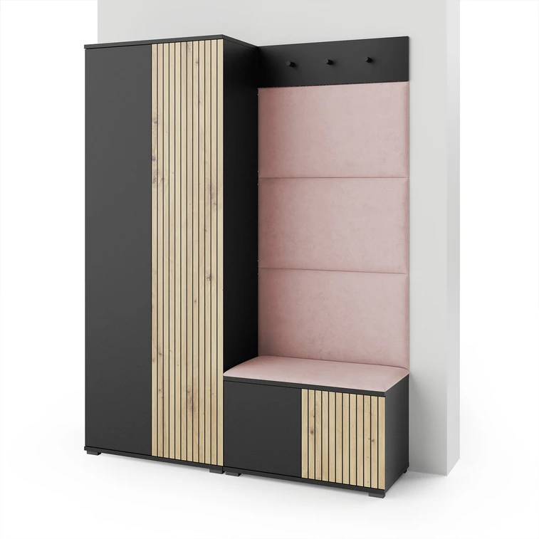 Moderná predsieňová stena je praktický prvok do vstupných priestorov vášho domu. Predsieňová stena obsahuje čalúnené panely, ktoré sa montujú priamo na stenu za pomoci lepidla. Poťah panelov je tkanina Trinity. Bezúchytkové čelá dvierok zaisťujú pohodlné používanie - systém TIP-ON otvára sa jemným zatlačením na čelo dvierok.