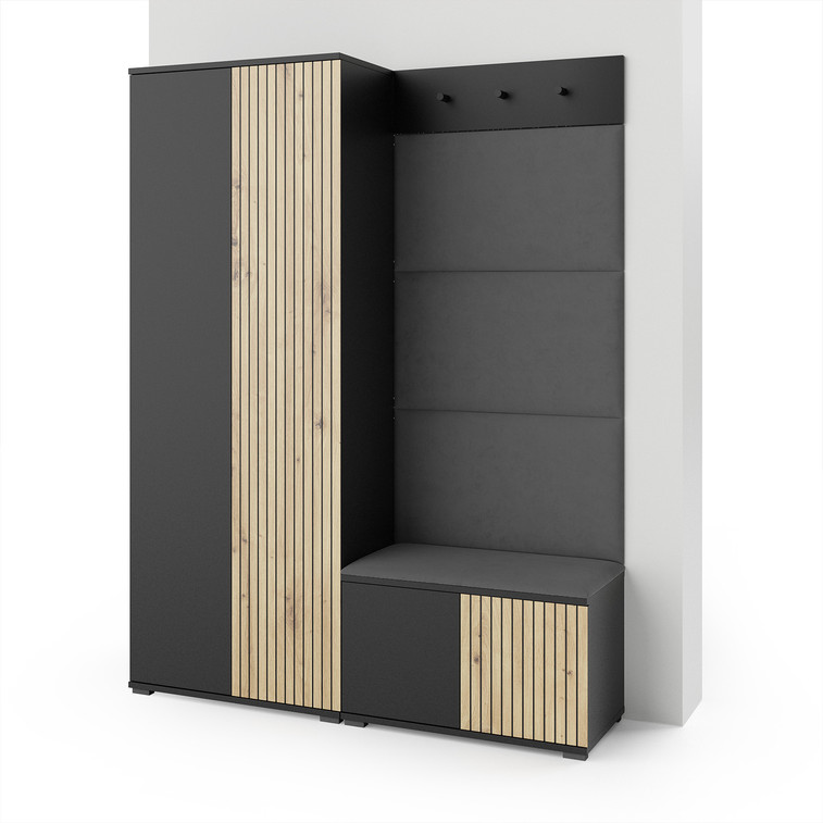 Moderná predsieňová stena je praktický prvok do vstupných priestorov vášho domu. Predsieňová stena obsahuje čalúnené panely, ktoré sa montujú priamo na stenu za pomoci lepidla. Poťah panelov je tkanina Trinity. Bezúchytkové čelá dvierok zaisťujú pohodlné používanie - systém TIP-ON otvára sa jemným zatlačením na čelo dvierok.