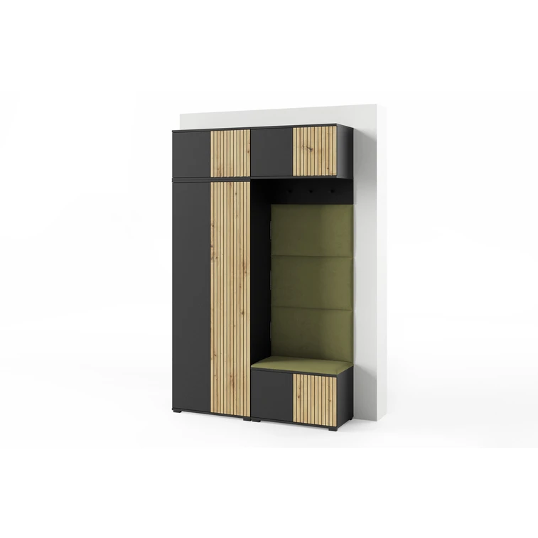 Moderná predsieňová stena je praktický prvok do vstupných priestorov vášho domu. Predsieňová stena obsahuje čalúnené panely, ktoré sa montujú priamo na stenu za pomoci lepidla. Poťah panelov je tkanina Trinity. Bezúchytkové čelá dvierok zaisťujú pohodlné používanie - systém TIP-ON otvára sa jemným zatlačením na čelo dvierok.