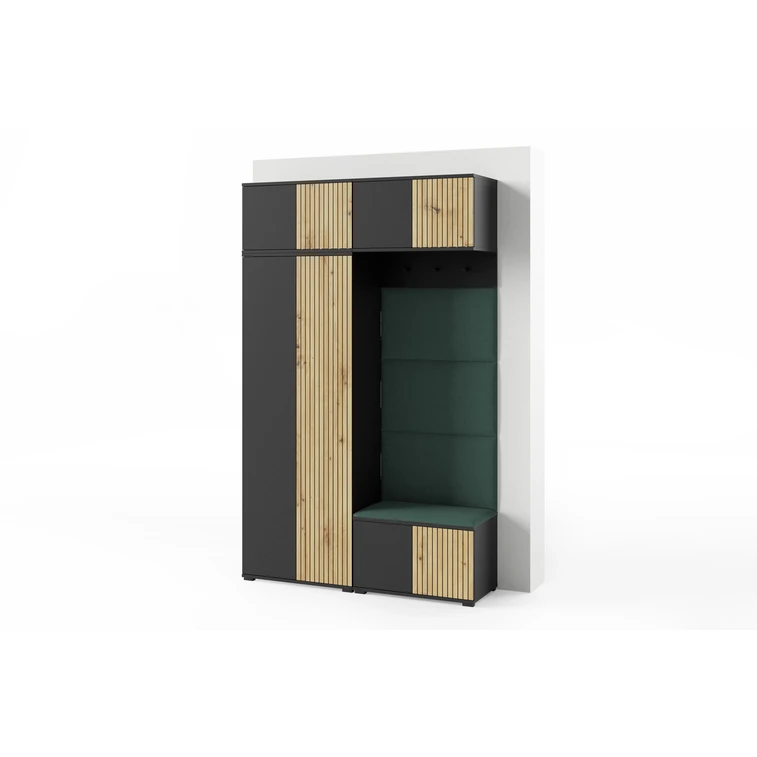 Moderná predsieňová stena je praktický prvok do vstupných priestorov vášho domu. Predsieňová stena obsahuje čalúnené panely, ktoré sa montujú priamo na stenu za pomoci lepidla. Poťah panelov je tkanina Trinity. Bezúchytkové čelá dvierok zaisťujú pohodlné používanie - systém TIP-ON otvára sa jemným zatlačením na čelo dvierok.