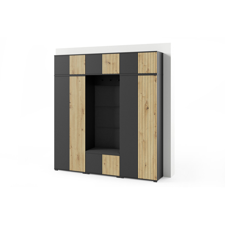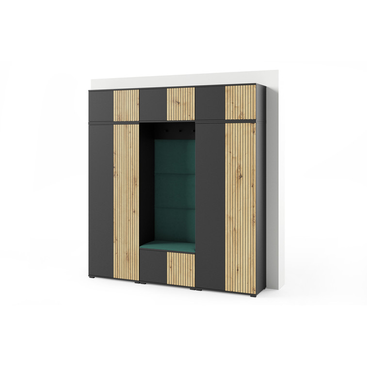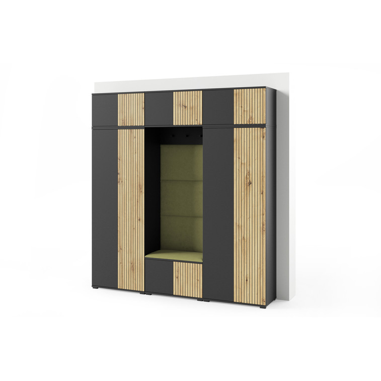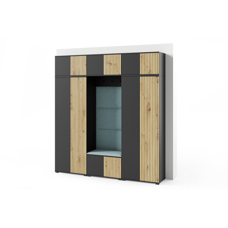 Moderná predsieňová stena je praktický prvok do vstupných priestorov vášho domu. Predsieňová stena obsahuje čalúnené panely, ktoré sa montujú priamo na stenu za pomoci lepidla. Poťah panelov je tkanina Trinity. Bezúchytkové čelá dvierok zaisťujú pohodlné používanie - systém TIP-ON otvára sa jemným zatlačením na čelo dvierok.