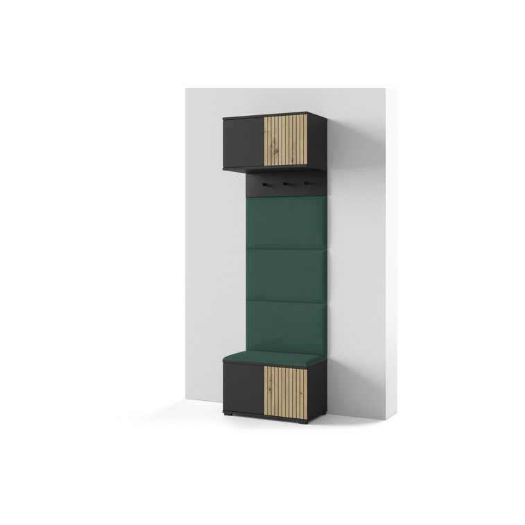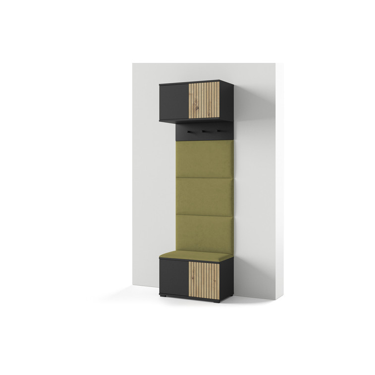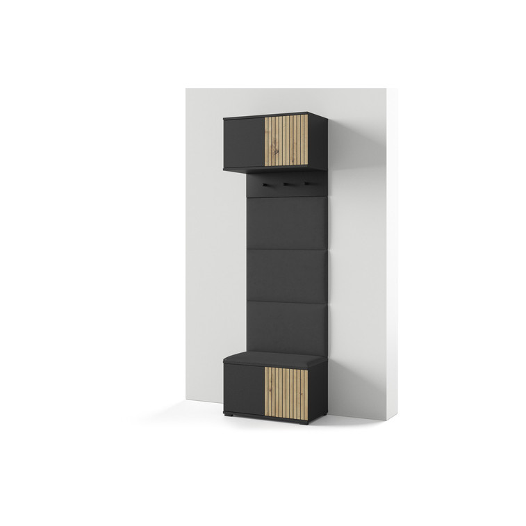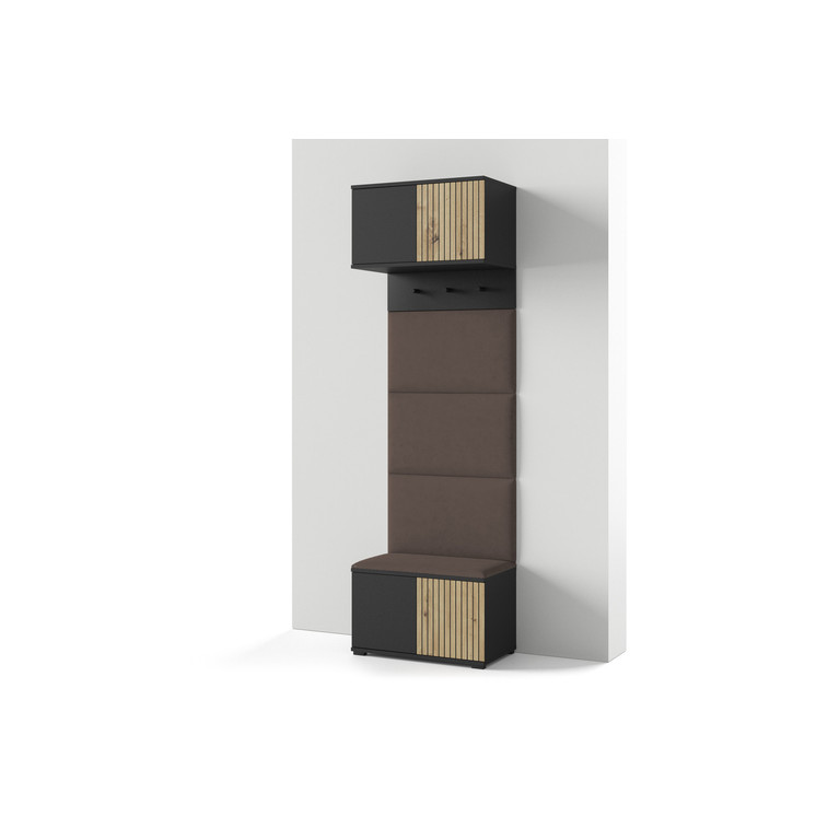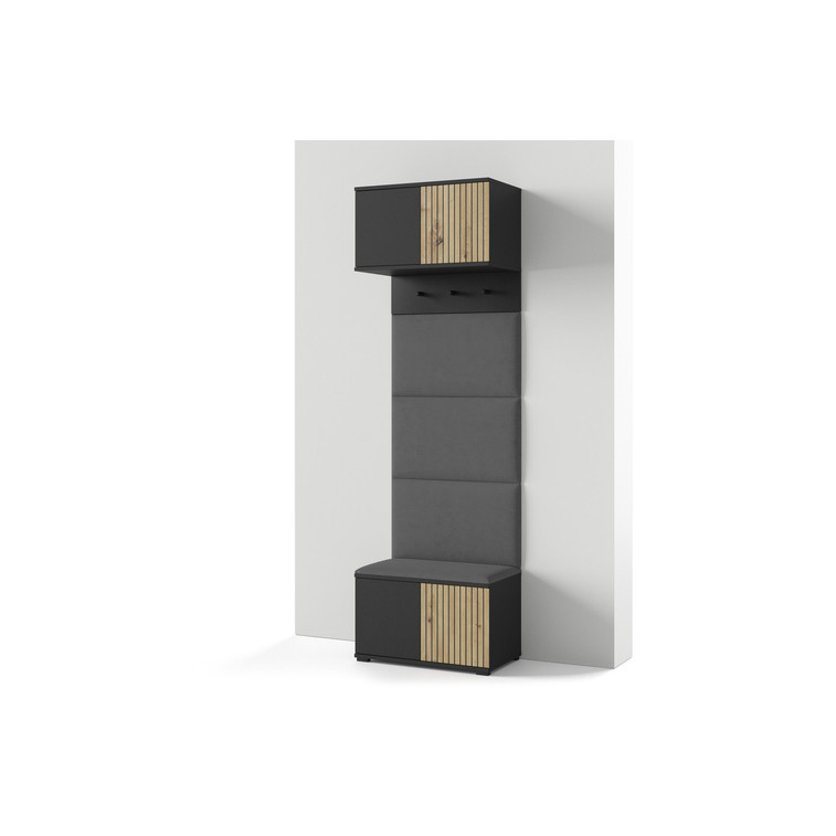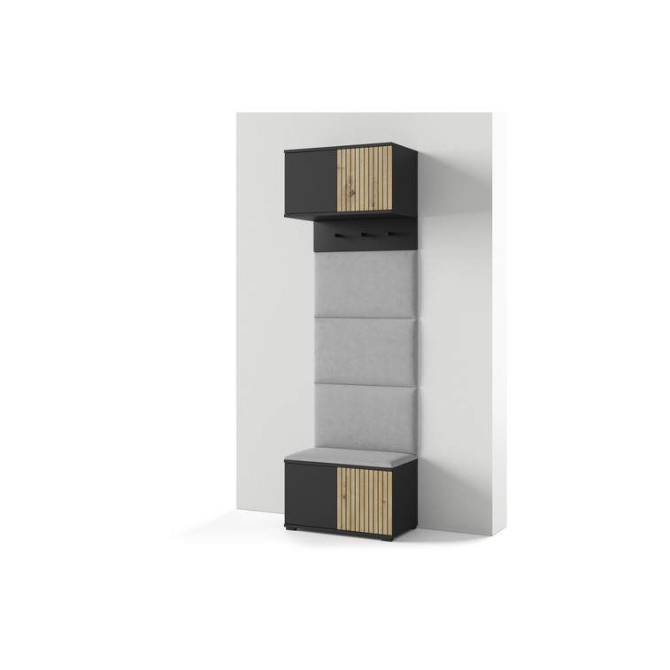 Moderná predsieňová stena je praktický prvok do vstupných priestorov vášho domu. Predsieňová stena obsahuje čalúnené panely, ktoré sa montujú priamo na stenu za pomoci lepidla. Poťah panelov je tkanina Trinity. Bezúchytkové čelá dvierok zaisťujú pohodlné používanie - systém TIP-ON otvára sa jemným zatlačením na čelo dvierok.