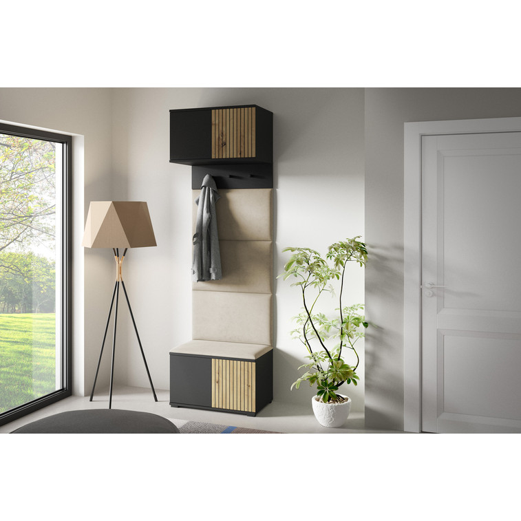 Moderná predsieňová stena je praktický prvok do vstupných priestorov vášho domu. Predsieňová stena obsahuje čalúnené panely, ktoré sa montujú priamo na stenu za pomoci lepidla. Poťah panelov je tkanina Trinity. Bezúchytkové čelá dvierok zaisťujú pohodlné používanie - systém TIP-ON otvára sa jemným zatlačením na čelo dvierok.