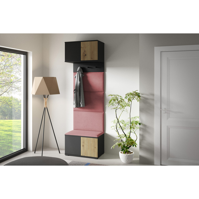 Moderná predsieňová stena je praktický prvok do vstupných priestorov vášho domu. Predsieňová stena obsahuje čalúnené panely, ktoré sa montujú priamo na stenu za pomoci lepidla. Poťah panelov je tkanina Trinity. Bezúchytkové čelá dvierok zaisťujú pohodlné používanie - systém TIP-ON otvára sa jemným zatlačením na čelo dvierok.