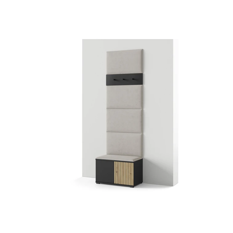 Moderná predsieňová stena je praktický prvok do vstupných priestorov vášho domu. Predsieňová stena obsahuje čalúnené panely, ktoré sa montujú priamo na stenu za pomoci lepidla. Poťah panelov je tkanina Trinity. Bezúchytkové čelá dvierok zaisťujú pohodlné používanie - systém TIP-ON otvára sa jemným zatlačením na čelo dvierok.