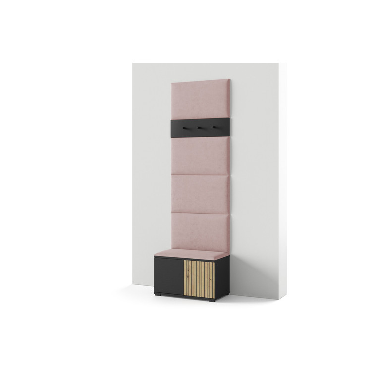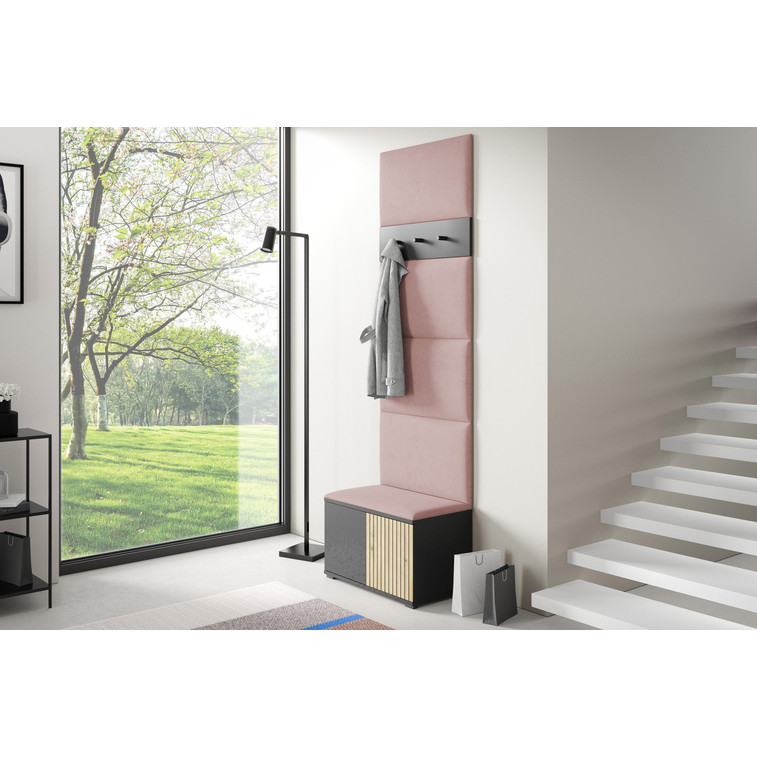 Moderná predsieňová stena je praktický prvok do vstupných priestorov vášho domu. Predsieňová stena obsahuje čalúnené panely, ktoré sa montujú priamo na stenu za pomoci lepidla. Poťah panelov je tkanina Trinity. Bezúchytkové čelá dvierok zaisťujú pohodlné používanie - systém TIP-ON otvára sa jemným zatlačením na čelo dvierok.