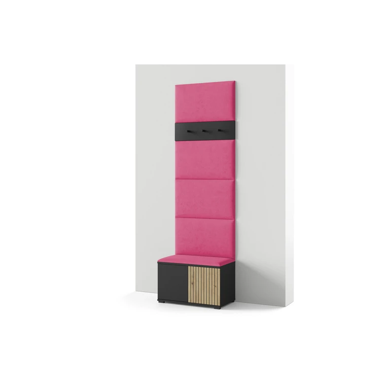 Moderná predsieňová stena je praktický prvok do vstupných priestorov vášho domu. Predsieňová stena obsahuje čalúnené panely, ktoré sa montujú priamo na stenu za pomoci lepidla. Poťah panelov je tkanina Trinity. Bezúchytkové čelá dvierok zaisťujú pohodlné používanie - systém TIP-ON otvára sa jemným zatlačením na čelo dvierok.