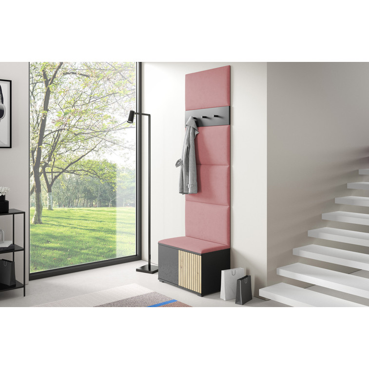 Moderná predsieňová stena je praktický prvok do vstupných priestorov vášho domu. Predsieňová stena obsahuje čalúnené panely, ktoré sa montujú priamo na stenu za pomoci lepidla. Poťah panelov je tkanina Trinity. Bezúchytkové čelá dvierok zaisťujú pohodlné používanie - systém TIP-ON otvára sa jemným zatlačením na čelo dvierok.
