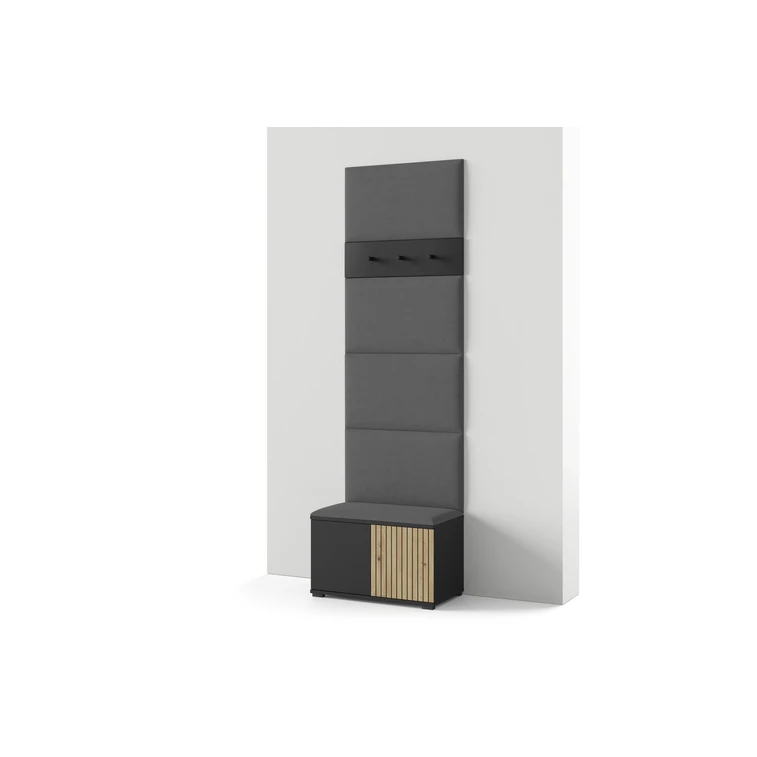 Moderná predsieňová stena je praktický prvok do vstupných priestorov vášho domu. Predsieňová stena obsahuje čalúnené panely, ktoré sa montujú priamo na stenu za pomoci lepidla. Poťah panelov je tkanina Trinity. Bezúchytkové čelá dvierok zaisťujú pohodlné používanie - systém TIP-ON otvára sa jemným zatlačením na čelo dvierok.