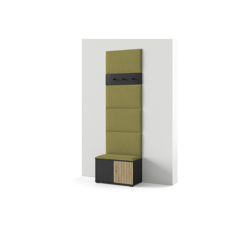 Moderná predsieňová stena je praktický prvok do vstupných priestorov vášho domu. Predsieňová stena obsahuje čalúnené panely, ktoré sa montujú priamo na stenu za pomoci lepidla. Poťah panelov je tkanina Trinity. Bezúchytkové čelá dvierok zaisťujú pohodlné používanie - systém TIP-ON otvára sa jemným zatlačením na čelo dvierok.