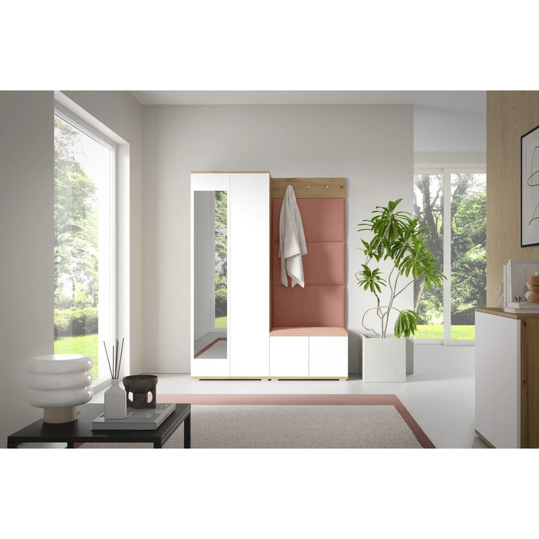 Je to praktický prvok do vstupných priestorov vášho domu. Predsieňová stena obsahuje čalúnené panely, ktoré sa montujú priamo na stenu za pomoci lepidla. Poťah panelov je tkanina Trinity. Predsieňová stena sa skladá z niekoľkých častí. Táto sada obsahuje: 1x šatníkovú skriňu, 1x botník, vešiak, 4 panely.