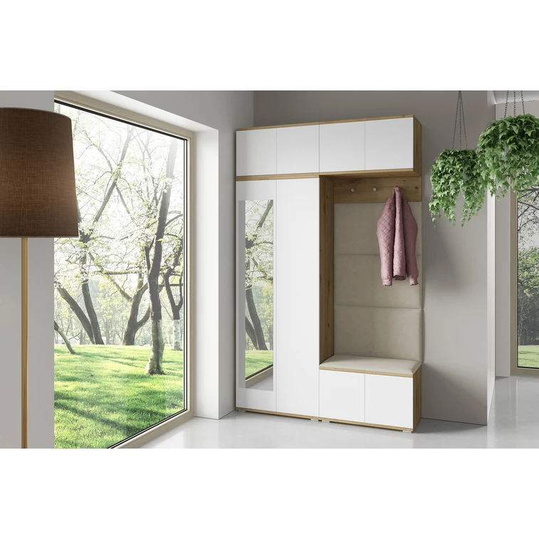 Je to praktický prvok do vstupných priestorov vášho domu. Predsieňová stena obsahuje čalúnené panely, ktoré sa montujú priamo na stenu za pomoci lepidla. Poťah panelov je tkanina Trinity. Predsieňová stena sa skladá z niekoľkých častí. Táto sada obsahuje: 1x šatníková skriňa, 1x nadstavba, 1x závesná skrinka, 1x botník, vešiak, 4 panely.