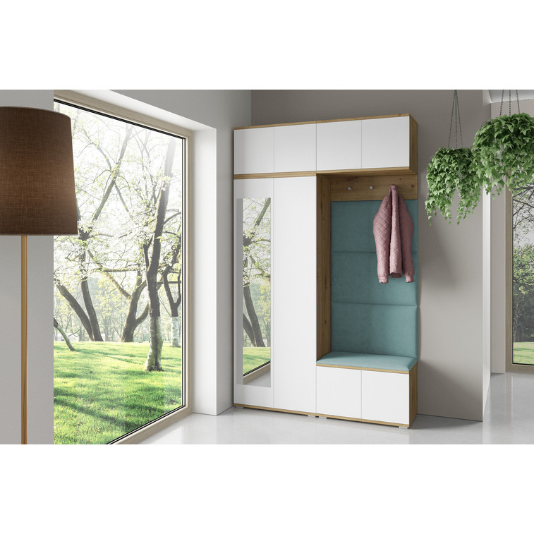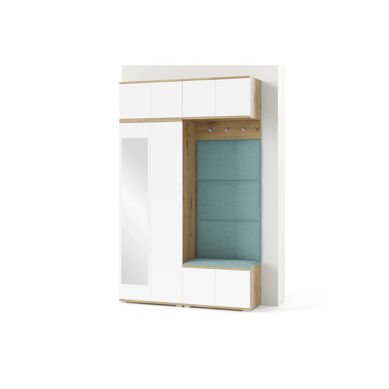 Je to praktický prvok do vstupných priestorov vášho domu. Predsieňová stena obsahuje čalúnené panely, ktoré sa montujú priamo na stenu za pomoci lepidla. Poťah panelov je tkanina Trinity. Predsieňová stena sa skladá z niekoľkých častí. Táto sada obsahuje: 1x šatníková skriňa, 1x nadstavba, 1x závesná skrinka, 1x botník, vešiak, 4 panely.