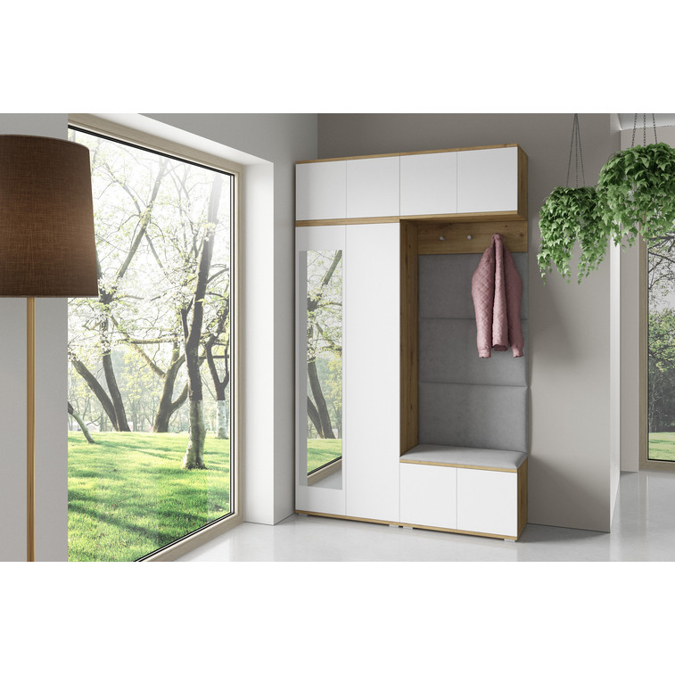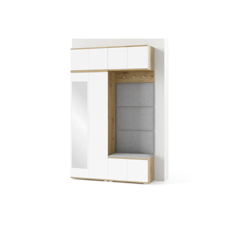 Je to praktický prvok do vstupných priestorov vášho domu. Predsieňová stena obsahuje čalúnené panely, ktoré sa montujú priamo na stenu za pomoci lepidla. Poťah panelov je tkanina Trinity. Predsieňová stena sa skladá z niekoľkých častí. Táto sada obsahuje: 1x šatníková skriňa, 1x nadstavba, 1x závesná skrinka, 1x botník, vešiak, 4 panely.