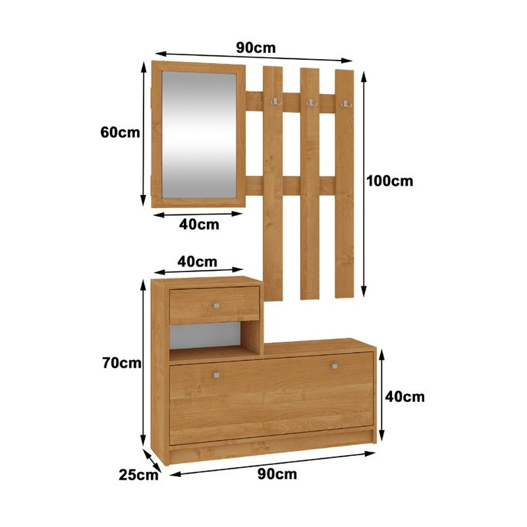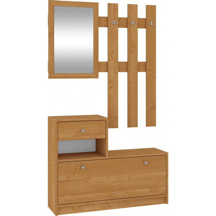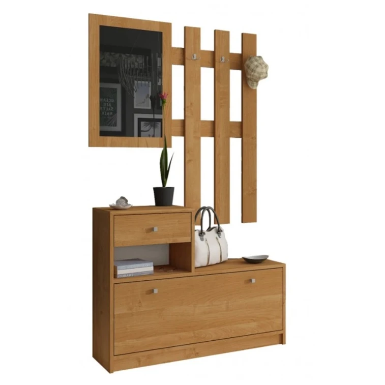Funkčná predsieňová stena zostavená z vešiaka, zrkadla a so skrinkou na topánky.
