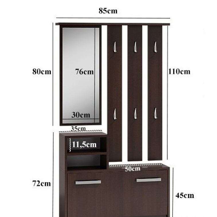 Funkčná predsieňová stena zostavená z vešiaka, zrkadla a skrinky na topánky. Praktická polica