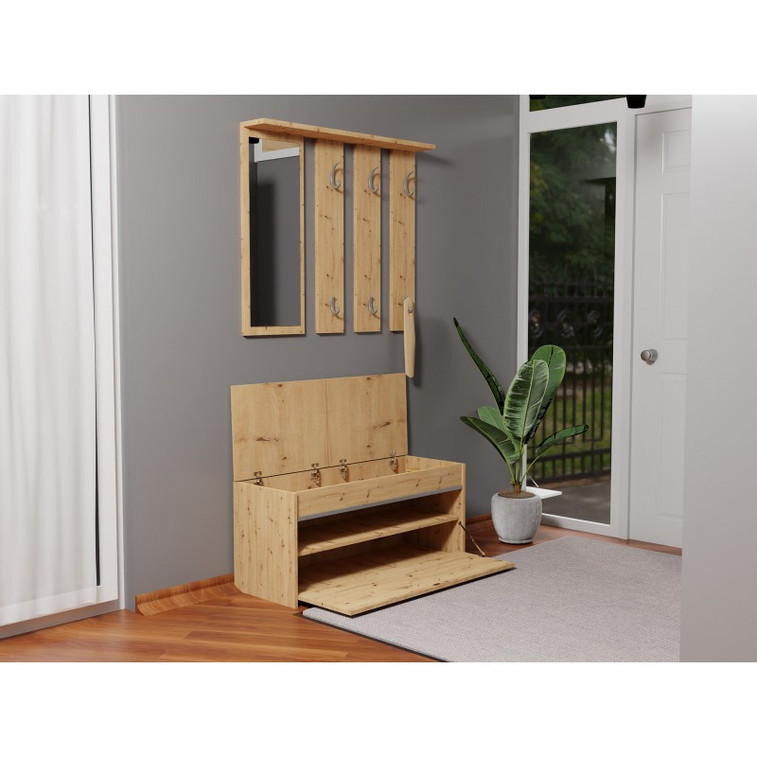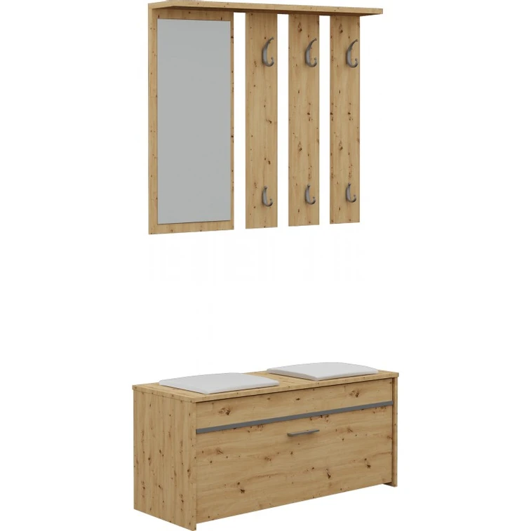 Funkčná predsieňová stena zostavená z vešiaka, zrkadla a skrinky na topánky.