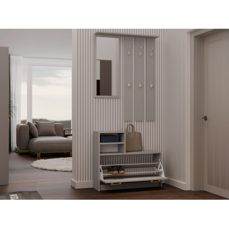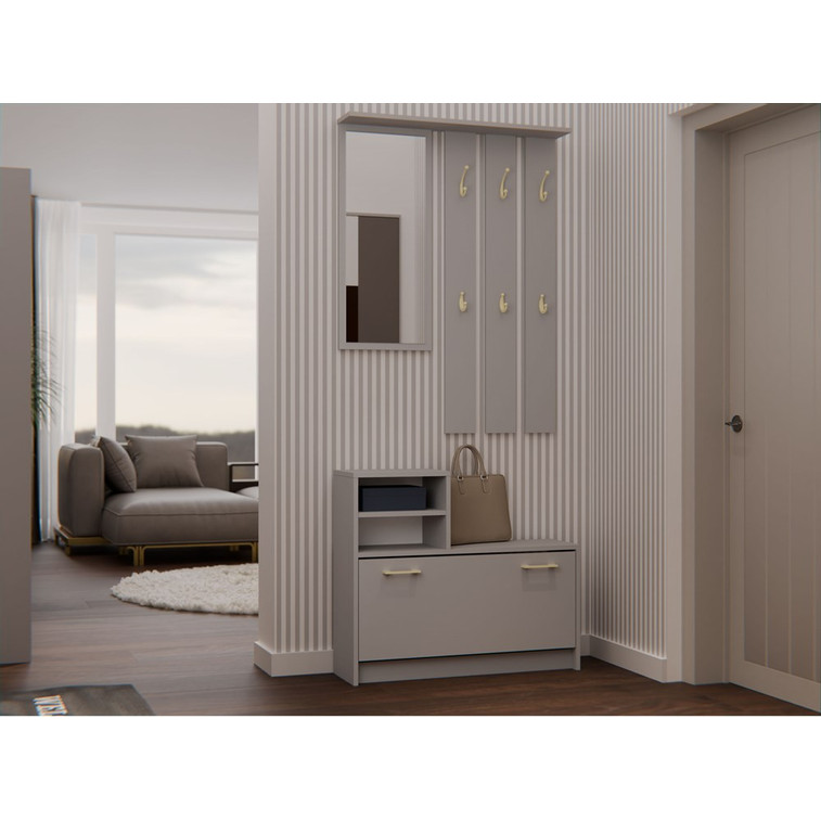 Vešiak: Obsahuje šesť vešiakov na vaše oblečenie. Výšku vešiaka môžete nastaviť podľa vlastných potrieb. Hneď vedľa vešiaka nájdete veľké zrkadlo. Pod vešiakom sú dve praktické police, do ktorých sa vám zmestia vaše doplnky, alebo dekorácie.