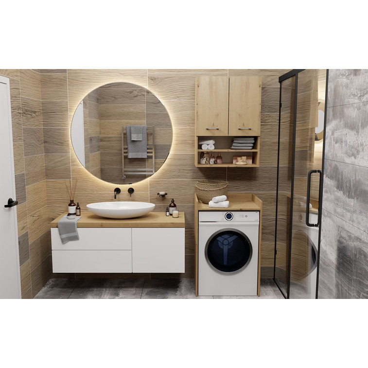 Voľne stojaci kúpeľňový regál je namontovaný na práčke a je perfektným riešením do malých priestorov, kde môžete ešte lepšie využiť priestor. Police dobre poslúžia na odloženie uterákov, kozmetiky a ďalších kúpeľňových doplnkov.