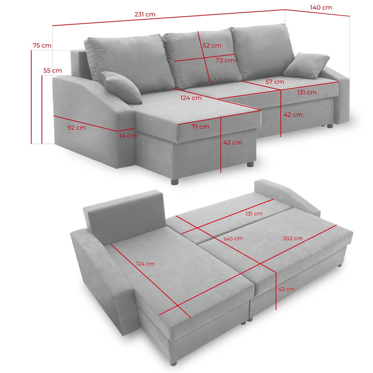 Pevná konštrukcia z dreva a OSB dosky. Poťah z kvalitnej látky Mikro v mnohých moderných farebných odtieňoch. Jednoduché rozkladanie sedacej súpravy na lôžkovú podobu. Moderný dizajn vhodný do všetkých súčasných interiérov.
