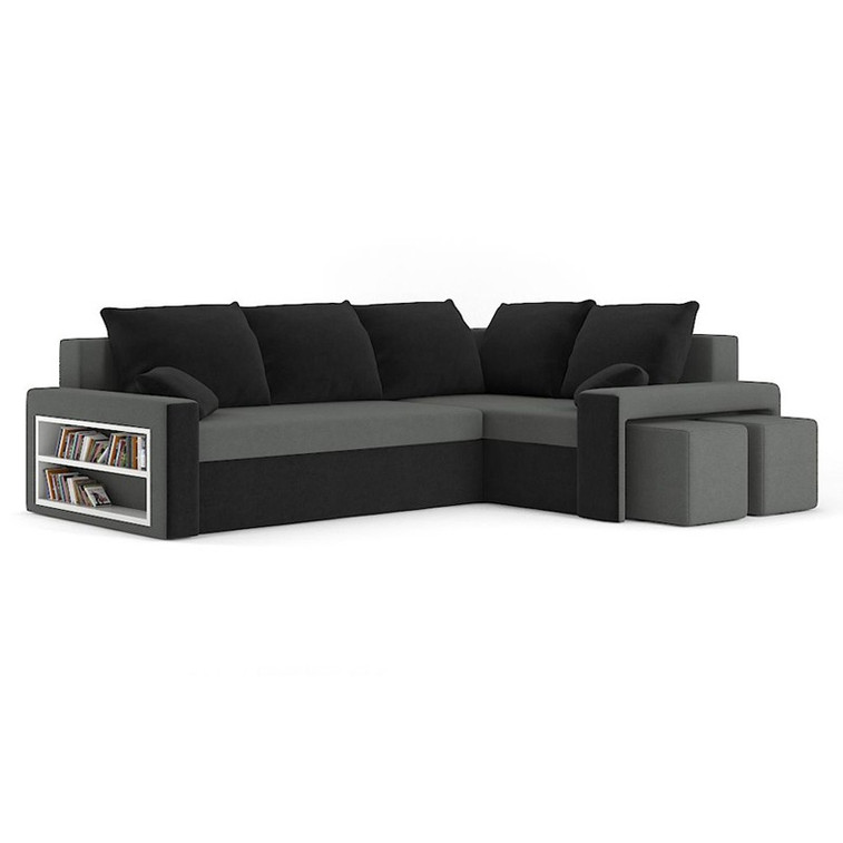 Rozkladacia sedacia rohová súprava s poličkou a taburety Metro. Pevná konštrukcia z dreva a OSB dosky. Poťah z kvalitnej látky Haiti v mnohých moderných farebných odtieňoch. Jednoduché rozkladanie pohovky na lôžkovú podobu. Dva veľké úložné priestory. Moderný dizajn vhodný do všetkých súčasných interiérov.