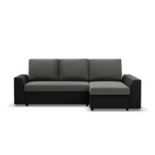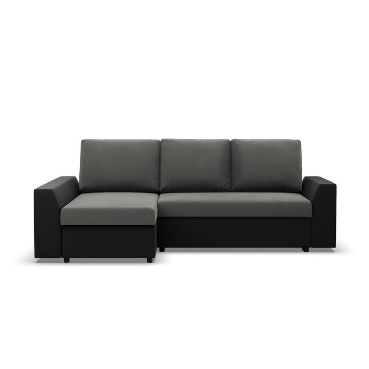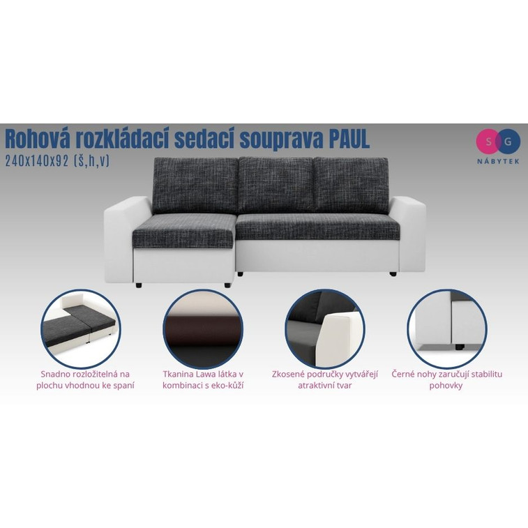 Rozkladacia sedacia rohová súprava Paul. Pevná konštrukcia z dreva a OSB dosky. Poťah z kvalitnej látky Velur v mnohých moderných farebných odtieňoch kombinovanej s eko kožou. Jednoduché rozkladanie pohovky na lôžkovú podobu. Moderný dizajn vhodný do všetkých súčasných interiérov. Sedacia súprava má 2 úložné priestory pod sedákmi.
