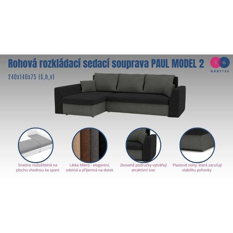 Rozkladacia sedacia rohová súprava Paul Model 2. Pevná konštrukcia z dreva a OSB dosky. Poťah z kvalitnej látky VELUR-Micro v mnohých moderných farebných odtieňoch. Jednoduché rozkladanie pohovky na lôžkovú podobu. Moderný design vhodný do všetkých súčasných interiérov. Sedacia súprava má 2 úložné priestory pod sedákmi.