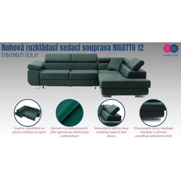 Rohová rozkladacia sedacia súprava Rigatto 12. Pevná konštrukcia z dreva a OSB dosky. Poťah z kvalitnej tkaniny. Nastaviteľné opierky hlavy umožňujú nastaviť uhol sklonu vo vzťahu ku krku a hlave používateľa, čo poskytuje dodatočnú podporu a zároveň maximálne pohodlie. Pochrómované efektné nožičky uľahčia upratovanie a systém rozkladania typu delfín rýchlo a ľahko premení sedaciu súpravu na lôžko. Moderný dizajn vhodný do všetkých súčasných interiérov.
