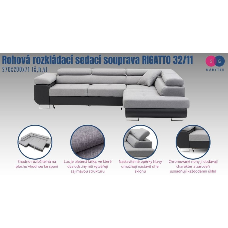 Rohová rozkladacia sedacia súprava RIGATTO je kus nábytku, ktorý sa vyznačuje mimoriadnou funkčnosťou. Nastaviteľné opierky hlavy umožňujú nastaviť uhol sklonu vo vzťahu ku krku a hlave užívateľa, čo poskytuje dodatočnú podporu a zároveň maximálne pohodlie. Pochrómované efektné nožičky uľahčia upratovanie a systém rozkladania typu delfín rýchlo a ľahko premení roh v spálni. Pri výrobe je použitá pružná pena T35 a vlnová pružina, vďaka ktorej pocítite ten najvyšší komfort.