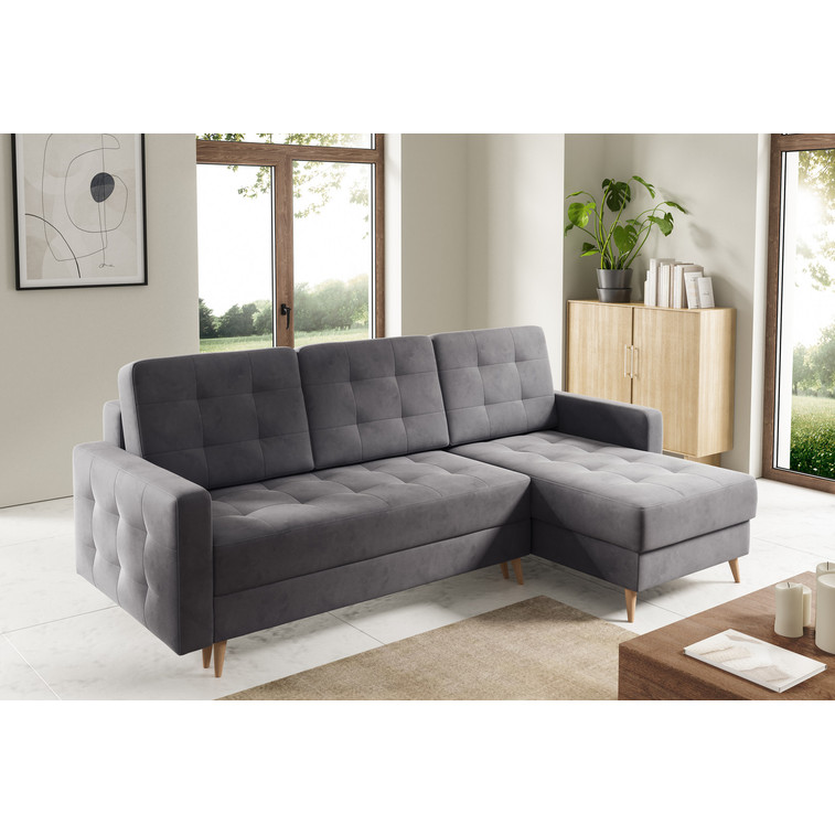 Pevná konštrukcia z dreva a OSB dosky. Poťah z kvalitnej látky Altair v moderných farebných odtieňoch. Jednoduché rozkladanie pohovky na lôžkovú podobu. Moderný škandinávsky dizajn vhodný do všetkých súčasných interiérov. Súčasťou pohovky je úložný priestor.
