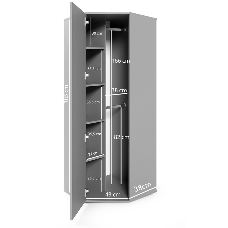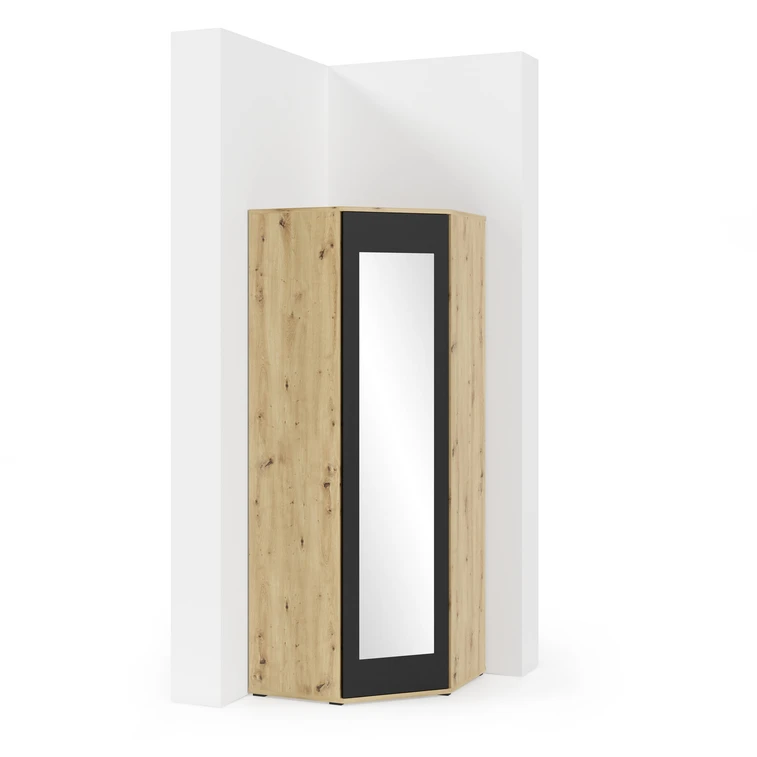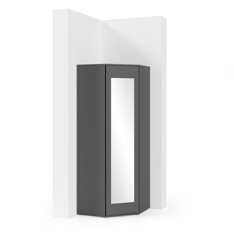 Moderná rohová skriňa Ami so zrkadlom sa skladá z úložných priestorov a 2 šatníkových tyčí. Vďaka svojmu tvaru sa výborne hodí na zaplnenie prázdneho rohu v miestnosti. Je vyrobená z kvalitného lamina.