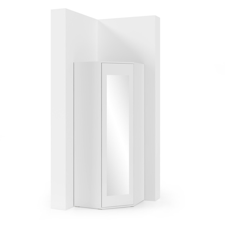 Moderná rohová skriňa Ami so zrkadlom sa skladá z úložných priestorov a 2 šatníkových tyčí. Vďaka svojmu tvaru sa výborne hodí na zaplnenie prázdneho rohu v miestnosti. Je vyrobená z kvalitného lamina.