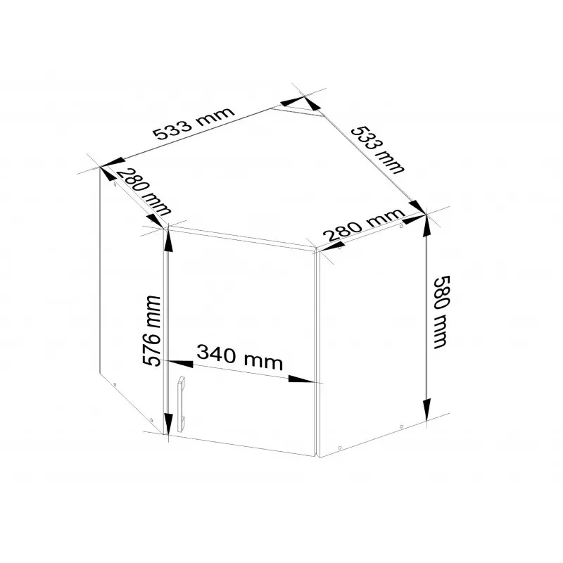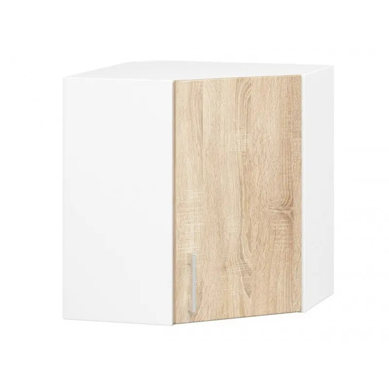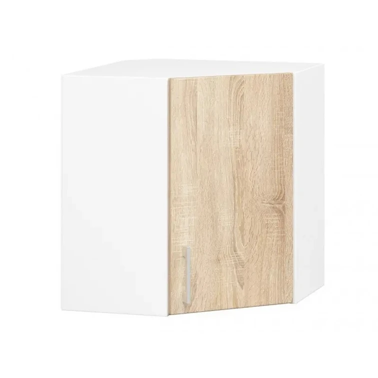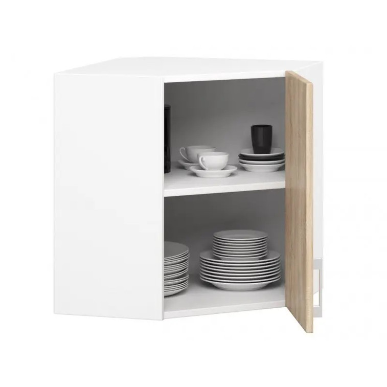 Pri zariaďovaní izieb robia najviac problémov rohy izieb. Na jednej strane do nich nie je možné umiestniť alebo nainštalovať obdĺžnikovú skriňu, pretože nie je možné úplne otvoriť jej dvierka bez poškodenia nábytku. Na druhú stranu ponechať nevyužitý priestor je nevkusné a málo funkčné. Problém je taký častý, že bola vyvinutá závesná rohová kuchynská skrinka. Vyznačuje sa tým, že sa skvele hodí do rohu miestnosti. To, čo bolo teraz problémom, sa ukázalo ako výhoda, pretože Závesná rohová kuchynská skrinka je oveľa priestrannejšia ako iné závesné skrinky. Štandardné nástenné skrinky sú hlboké 30 cm. Rohová kuchynská skrinka na stenu, ktorá prilieha k rohu miestnosti s hĺbkou až 56 cm! Nábytok je vyrobený z laminovanej dosky. Hrana je zakončená ABS dyhou, vďaka čomu je odolná proti mechanickému poškodeniu.