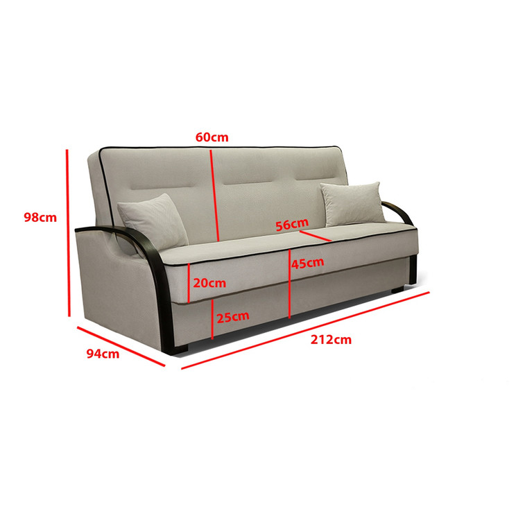 Pevná konštrukcia z dreva a OSB dosky. Boky kresla sú s drevenými prvkami. Dekoratívne vankúše sú súčasťou pohovky.