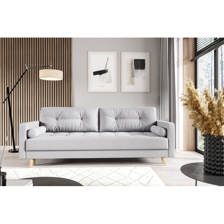 Pevná konštrukcia z dreva a OSB dosky. Poťah z kvalitnej látky Monolith v moderných farebných odtieňoch. Jednoduché rozkladanie pohovky na lôžkovú podobu. Moderný škandinávsky dizajn vhodný do všetkých súčasných interiérov.