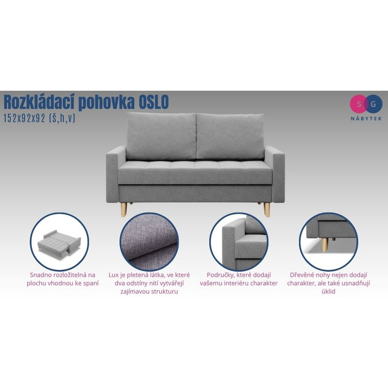 Pevná konštrukcia z dreva a OSB dosky. Jednoduché rozkladanie pohovky na lôžkovú podobu. Moderný škandinávsky dizajn vhodný do všetkých súčasných interiérov.