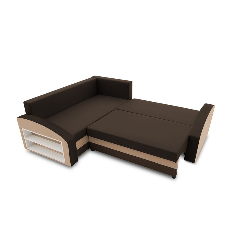 Pevná konštrukcia z dreva a OSB dosiek.Poťah z kvalitnej látky v mnohých moderných farebných odtieňoch. Jednoduché rozkladanie pohovky na lôžkovú podobu. Poličkysú umiestnené na boku sedačky. Moderný dezajn vhodný do všetkých súčasných interiérov.
