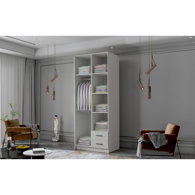 Šatníková skriňa kombinuje klasickú jednoduchosť a moderný dizajn. Je ideálna ako šatníková skriňa do predsiene alebo miesto na uloženie oblečenia v spálni alebo iných drobností každodennej potreby. Šatníková skriňa je rozdelená na dve časti. Na jednej strane sú police a dve zásuvky, a na druhej strane je závesná šatníková tyč a police.