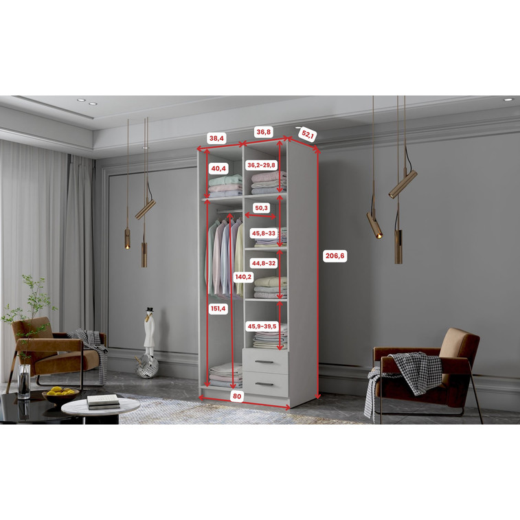Šatníková skriňa kombinuje klasickú jednoduchosť a moderný dizajn.Je ideálna ako šatníková skriňa do predsiene alebo miesto na uloženie oblečenia v spálni alebo iných drobností každodennej potreby. Šatníková skriňa je rozdelená na dve časti. Na jednej strane sú police a dve zásuvky, a na druhej strane je závesná šatníková tyč a police.