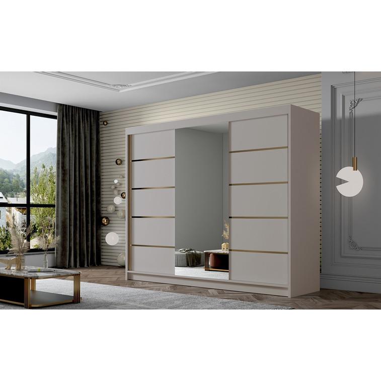 Posuvná šatníková skriňa Amber VI kombinuje klasickú jednoduchosť a moderný dizajn. Zrkadlo umiestnené na dverách dodáva svoje jedinečné kúzlo. Je ideálna ako šatníková skriňa do predsiene alebo miesto na uloženie oblečenia v spálni alebo iných drobností každodennej potreby.