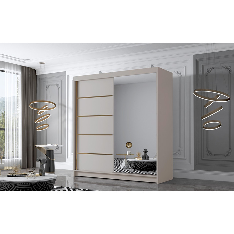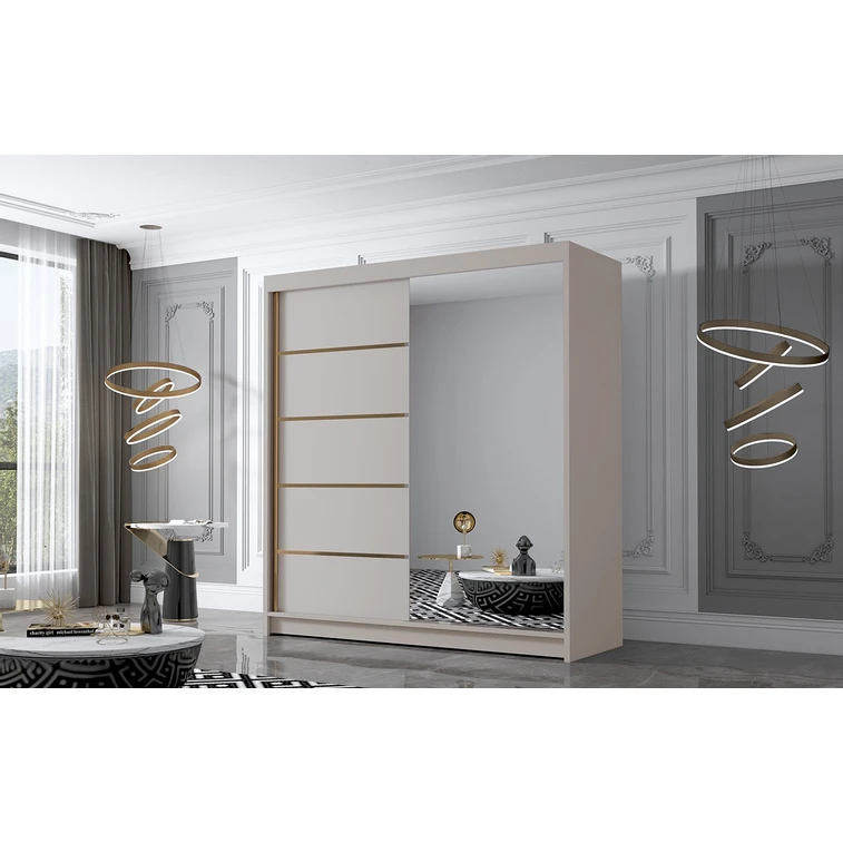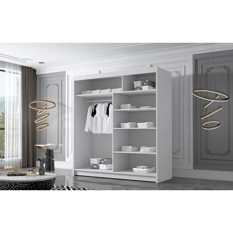 Posuvná šatníková skriňa BALI III kombinuje klasickú jednoduchosť a moderný dizajn. Zrkadlo umiestnené na dverách dodáva svoje jedinečné kúzlo. Je ideálna ako šatníková skriňa do predsiene alebo miesto na uloženie oblečenia v spálni alebo iných drobností každodennej potreby. Vnútro šatníkovej skrine je rozdelené na dve rovnaké časti. Na jednej strane sú police a na druhej strane je závesná šatníková tyč.