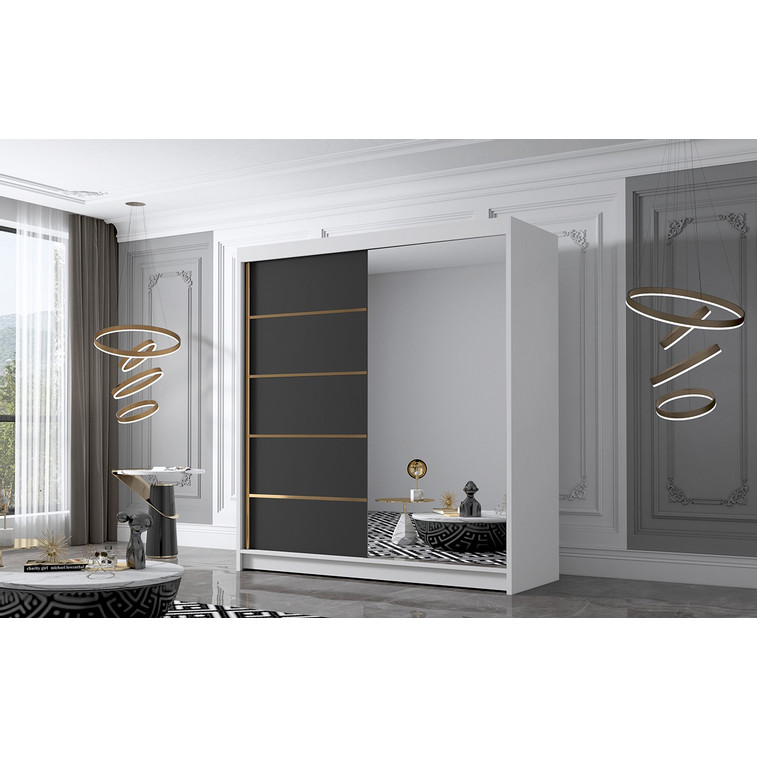 Posuvná šatníková skriňa BALI III kombinuje klasickú jednoduchosť a moderný dizajn. Zrkadlo umiestnené na dverách dodáva svoje jedinečné kúzlo. Je ideálna ako šatníková skriňa do predsiene alebo miesto na uloženie oblečenia v spálni alebo iných drobností každodennej potreby. Vnútro šatníkovej skrine je rozdelené na dve rovnaké časti. Na jednej strane sú police a na druhej strane je závesná šatníková tyč.