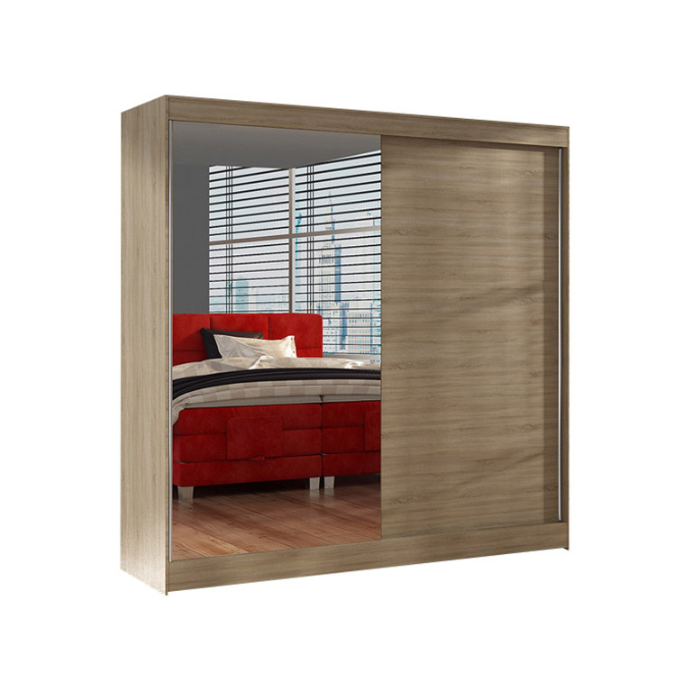 Priestranná šatníková skriňa BASTI I je vyrobená v modernom dizajne a ponúka veľké množstvo praktického úložného priestoru (viď obrázok). Neoceniteľný je systém trendových posuvných dverí so zrkadlom, ktoré uľahčujú manipuláciu a šetria priestor v interiéri. Korpus a dvere sú vyrobené z kvalitného lamina (16 mm). Šatníková skriňa BASTI I môže doplniť existujúce vybavenie izby. Údržba je jednoduchá, povrch je ľahko umývateľný, odolný voči pôsobeniu vody a zvýšenej teplote. Skriňa je dodávaná v demonte a v rôznom farebnom prevedení.